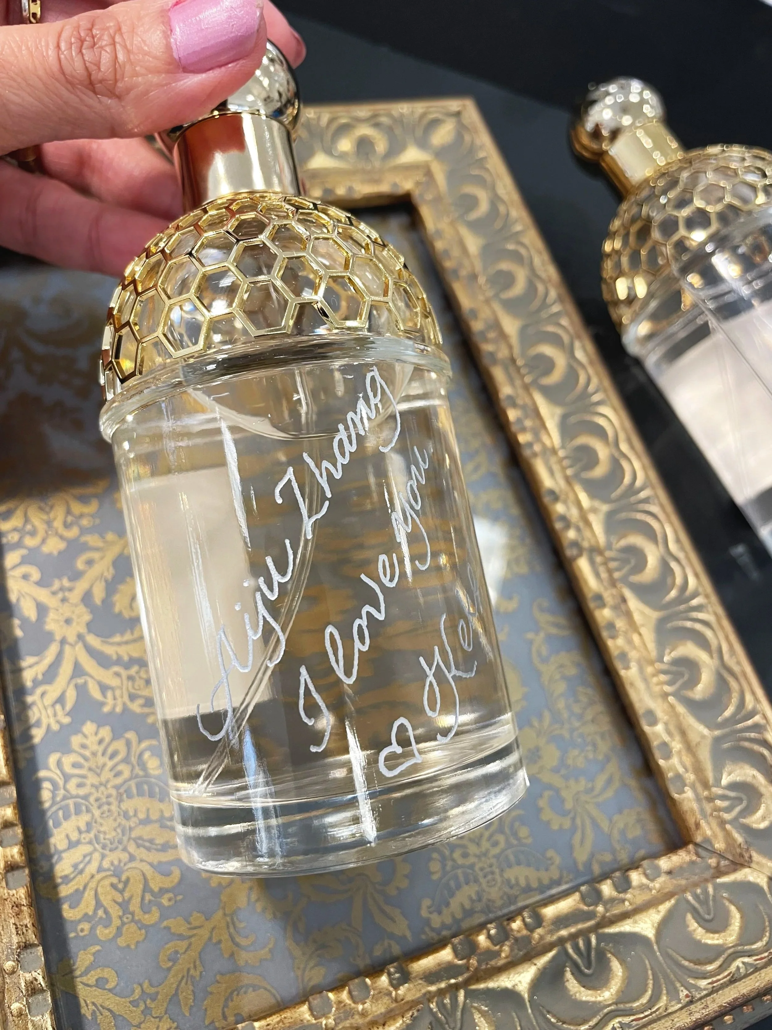 Engraving perfume bottles for luxury brand. This video is sped up, but it generally takes 2-3 minutes to engrave a bottle on-site.